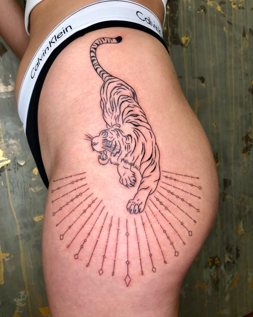 This design draws the eye to the tiger’s bold stance while framing the hip’s natural curves. You can keep the clean outline look or add shading later. It’s a striking combination of power and geometric precision.