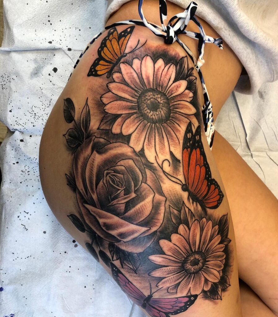 Rose, Daisy, and Butterfly Hip Tattoo