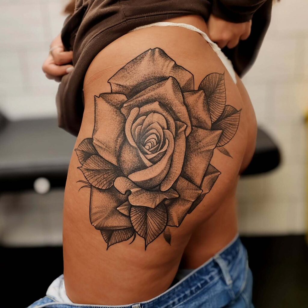 Black and Grey Rose Hip Tattoo