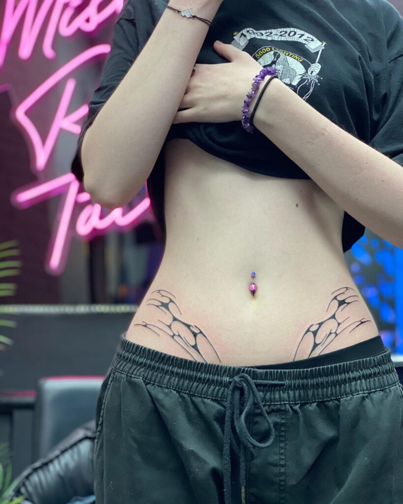 The simple black ink makes the shapes stand out against skin without needing extra shading. This tattoo pairs well with cropped tops or low-rise pants, showing off its edgy, modern style with every confident movement.