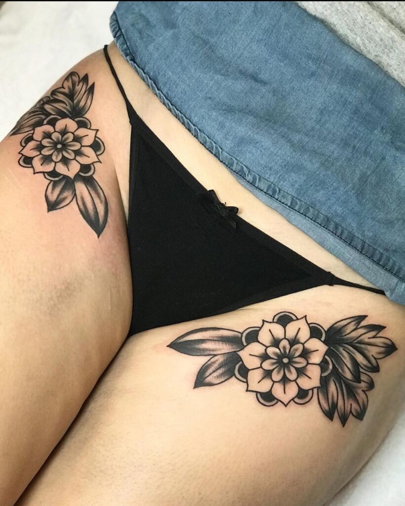 This tattoo features two matching flowers placed symmetrically on each side of the upper thigh and hip.