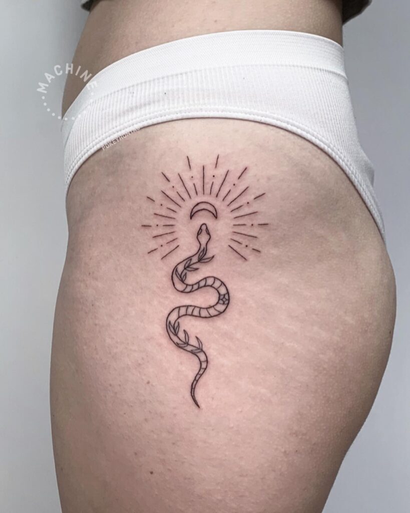 Snake and Crescent Moon Hip Tattoo