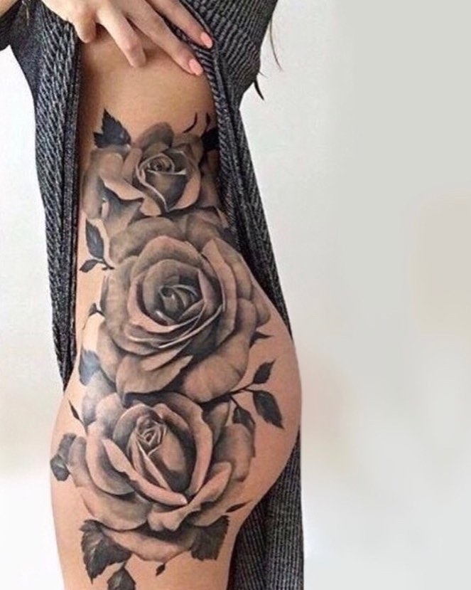 This tattoo shows three large black and grey roses flowing across the hip and upper thigh.