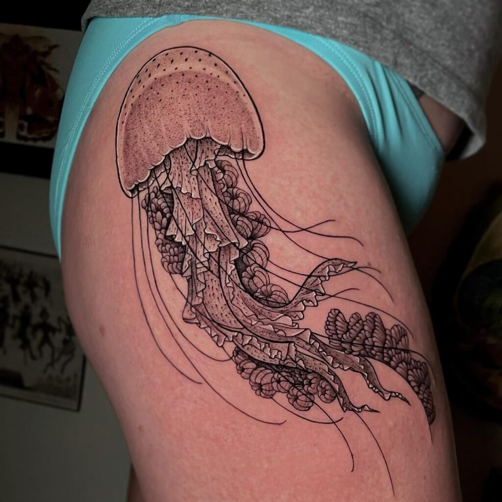 This tattoo presents a large jellyfish surrounded by coral shapes inspired by Cayman waters, placed along the hip and thigh.