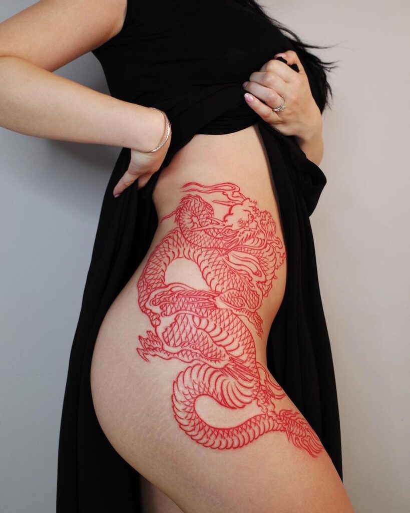 This tattoo showcases a large dragon drawn entirely in bold red ink, wrapping across the hip and upper thigh.