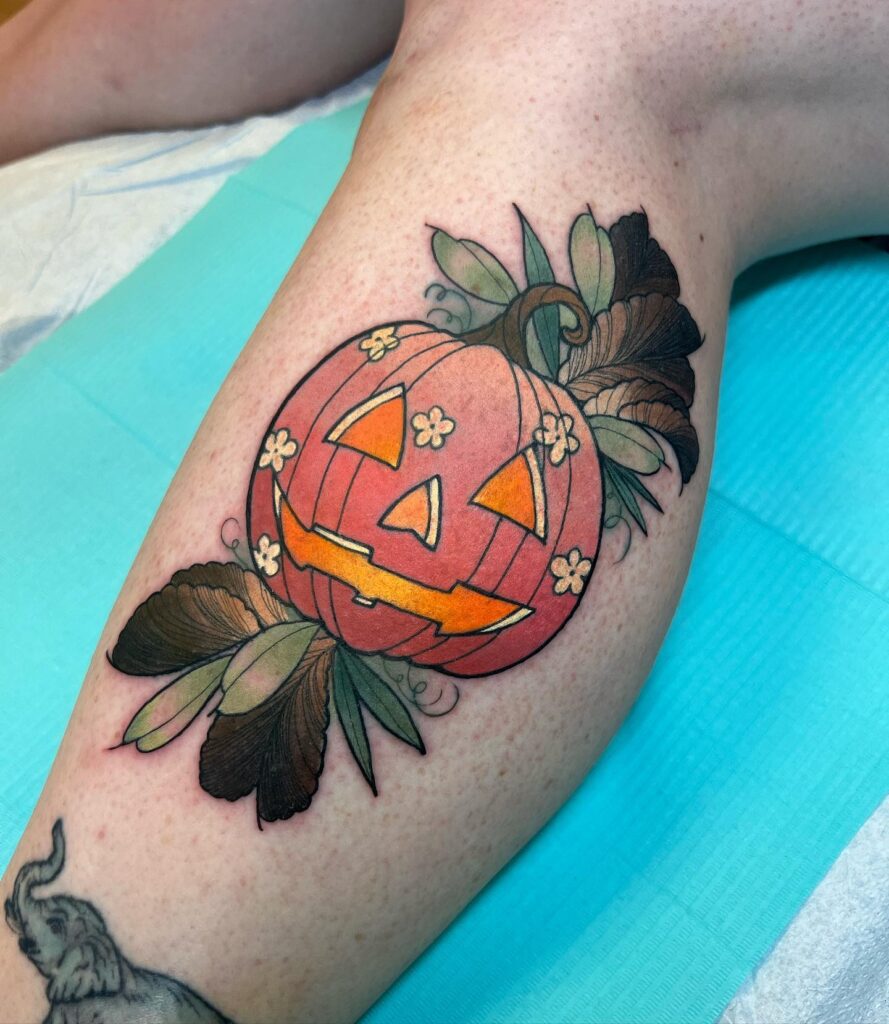 This tattoo presents a cheerful jack o’ lantern surrounded by lush leaves and delicate flower details. The pumpkin’s face is carved with the classic triangular eyes and wide smile, giving it a friendly, welcoming expression.