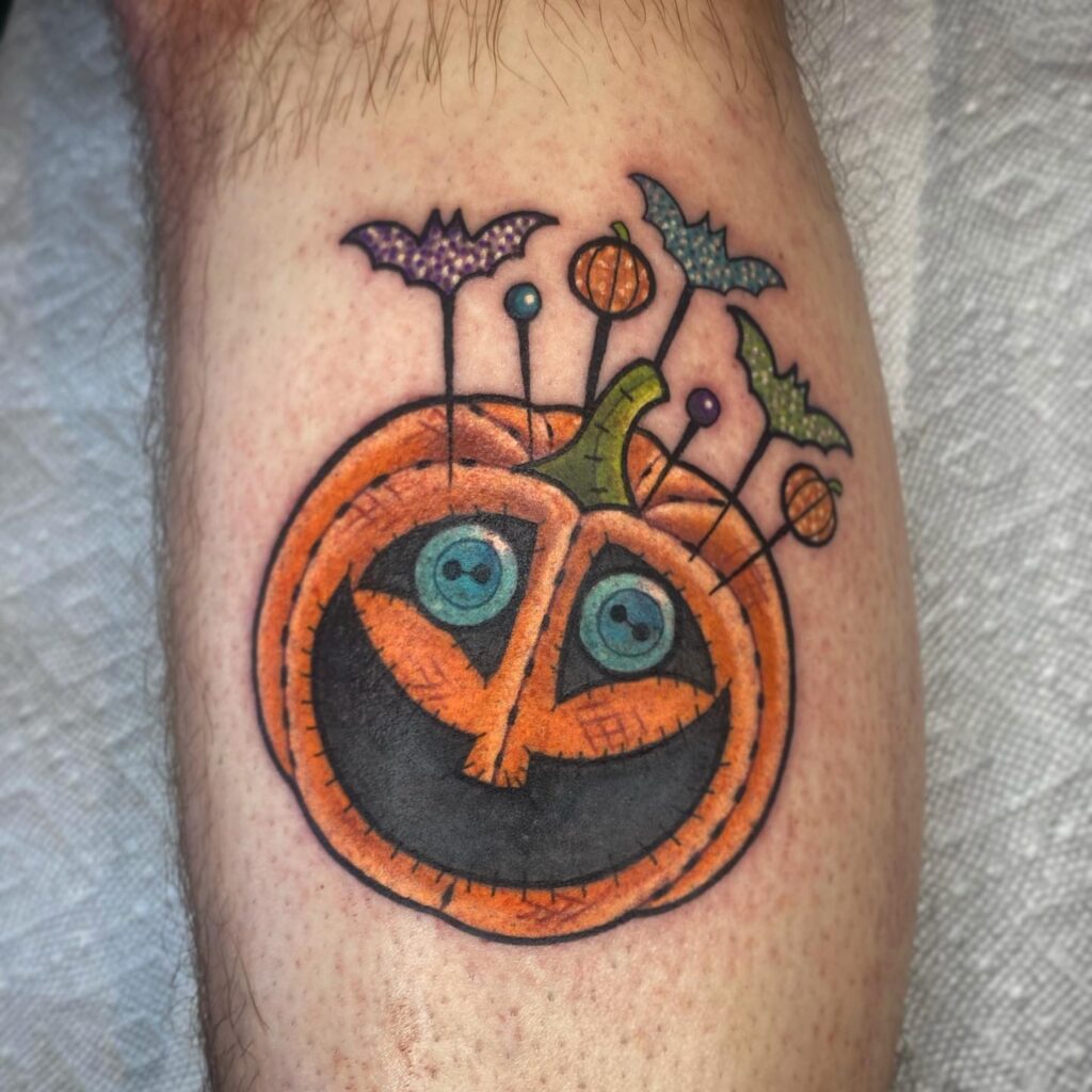 This tattoo puts a whimsical spin on Halloween imagery with a jack o’ lantern designed like a voodoo doll. Its stitched-like features and button-style eyes give it a quirky, handmade appearance.