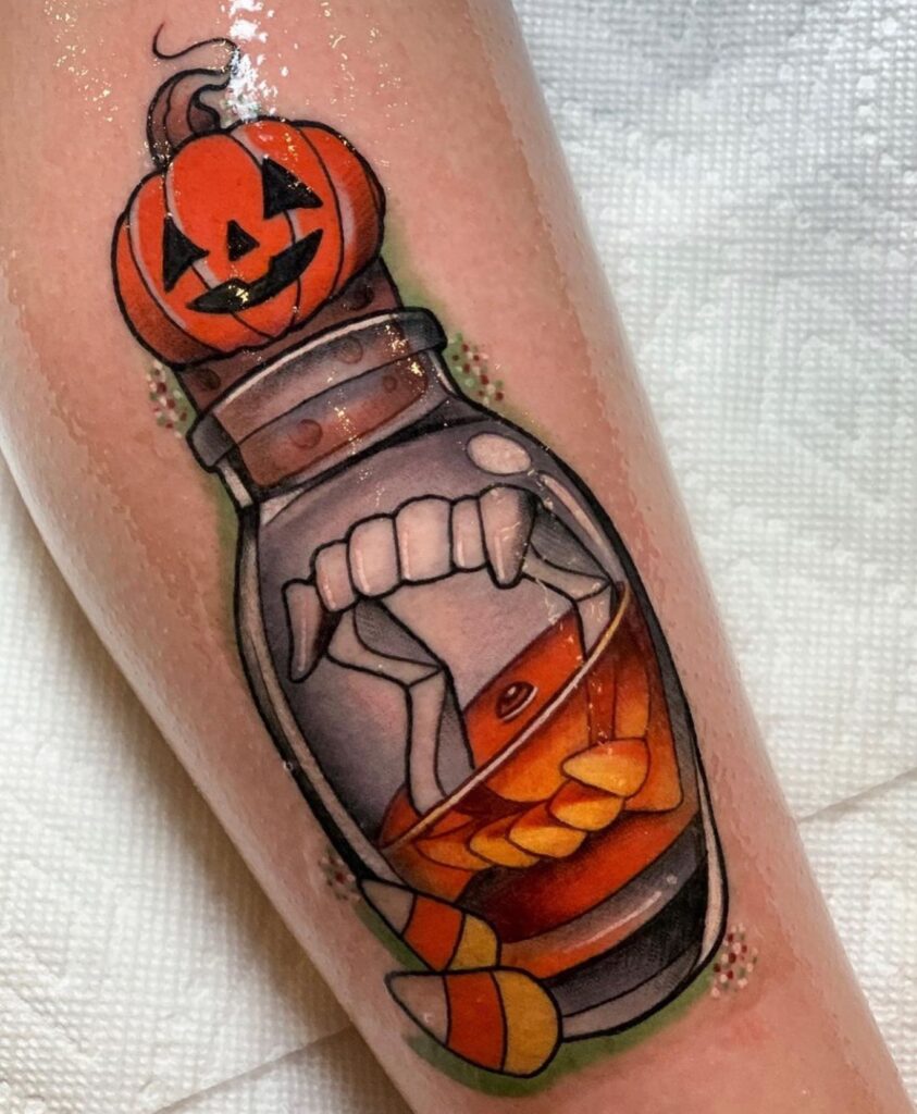 This creative tattoo features a jack o’ lantern perched atop a jar filled with Halloween treats. Inside the jar, vampire fangs grip candy corn, blending spooky and playful details.