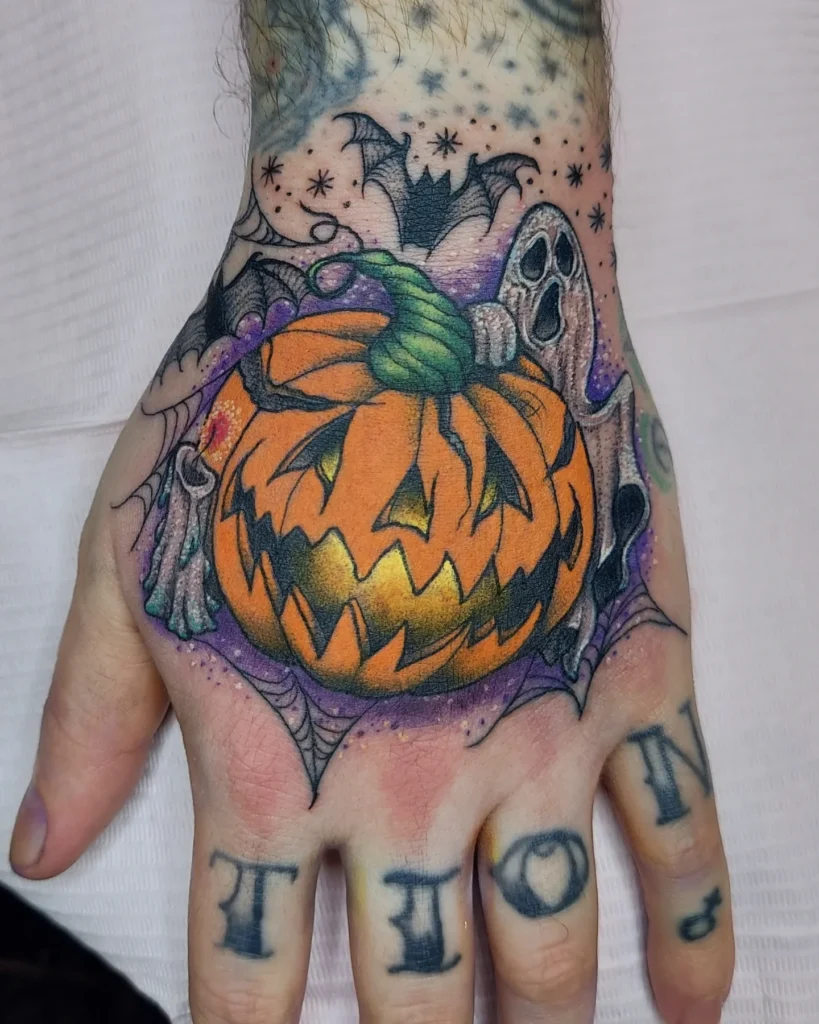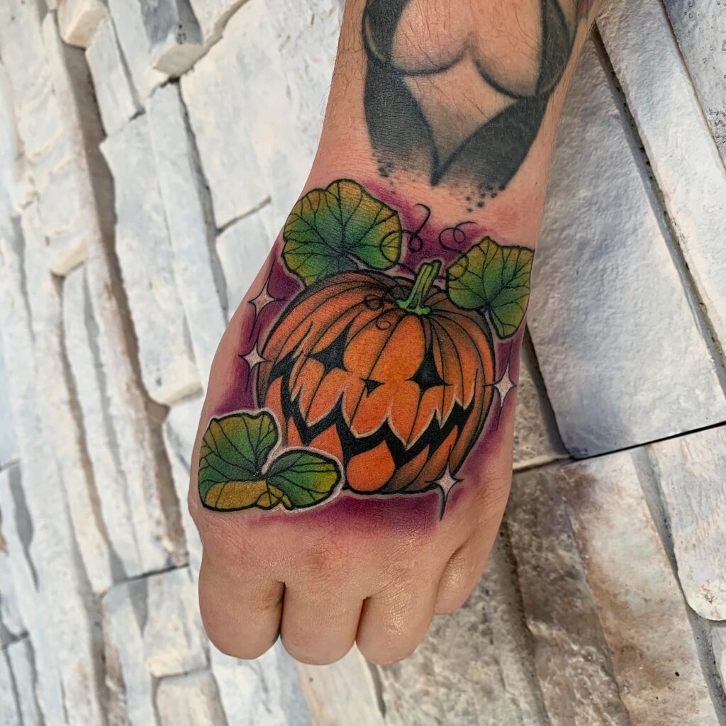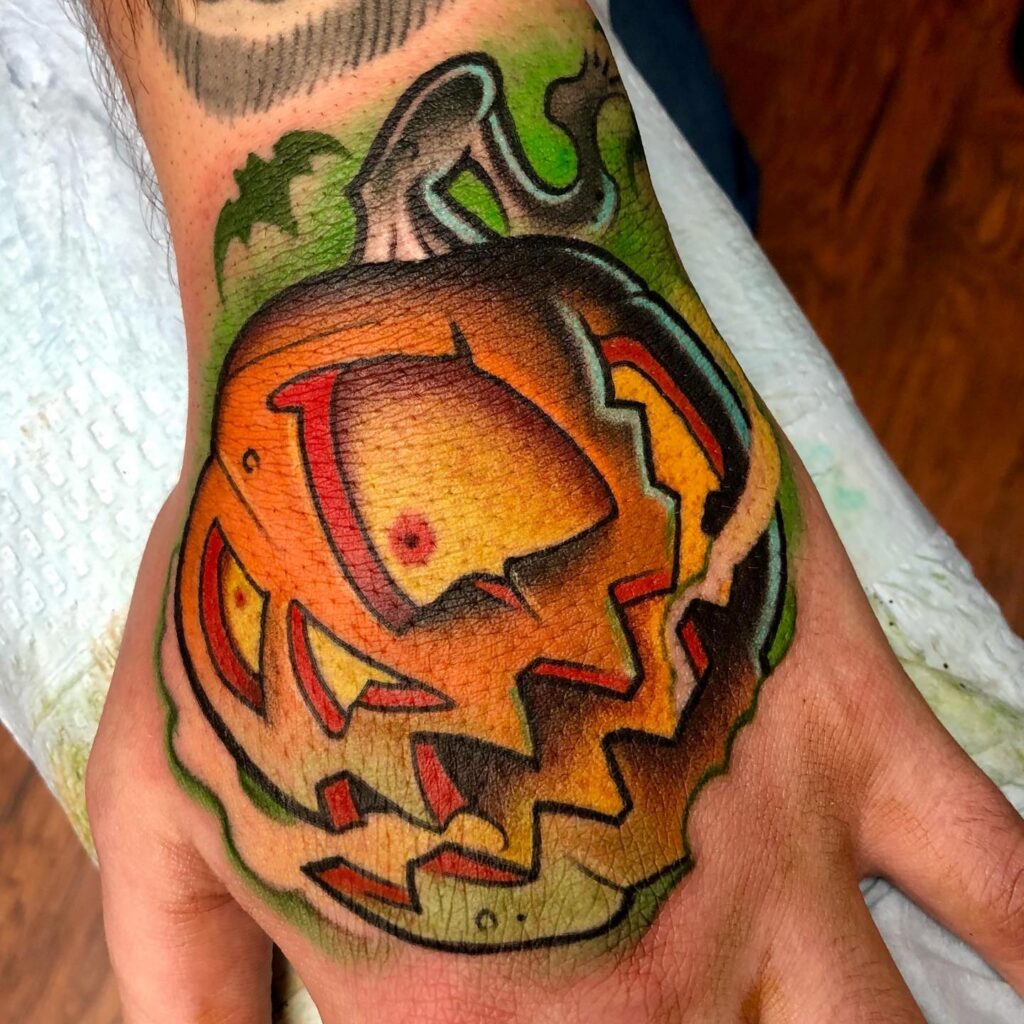 This tattoo features a grinning jack o’ lantern placed boldly on the hand, making it instantly eye-catching.