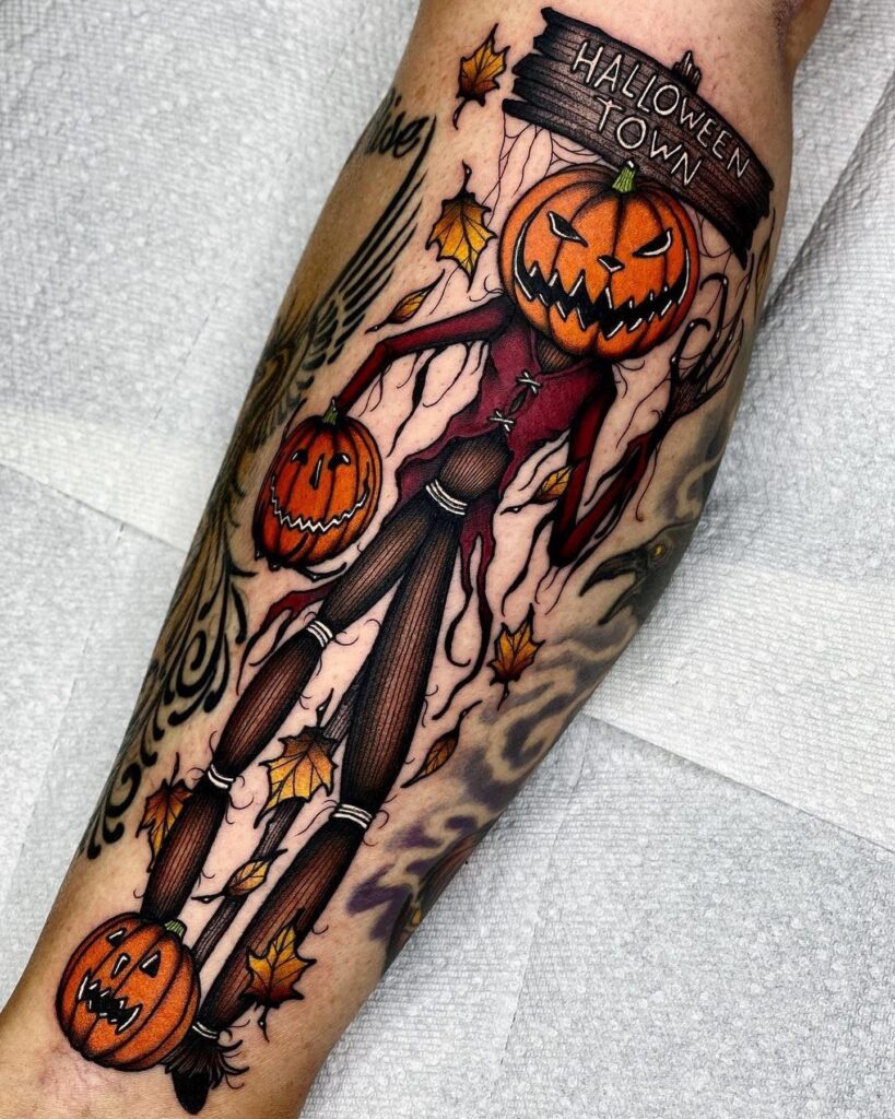 This tattoo features a tall, eerie scarecrow-like figure with a jack o’ lantern head standing under a “Halloween Town” sign.