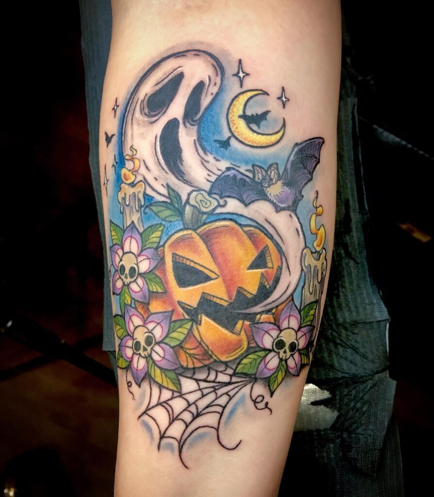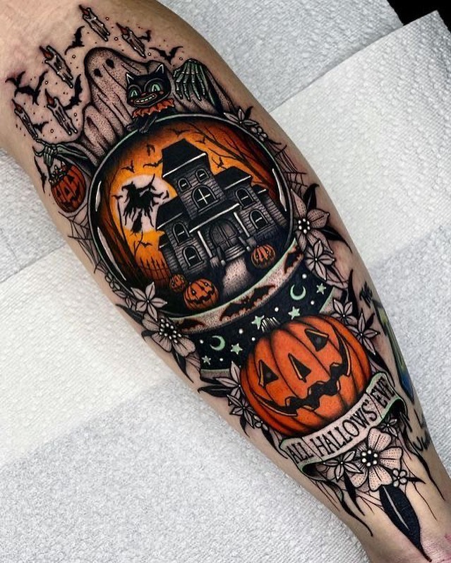 Below, a smiling jack o’ lantern rests above a banner reading “All Hallows Eve,” completing the design. The tattoo’s intricate details and festive atmosphere make it a true Halloween masterpiece.