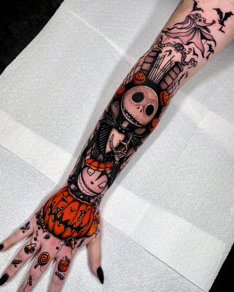 Zero, his loyal ghost dog, floats above among bats, adding whimsical charm. The design flows seamlessly down the arm, ending with a large carved jack o’ lantern at the hand, glowing with sharp expression.