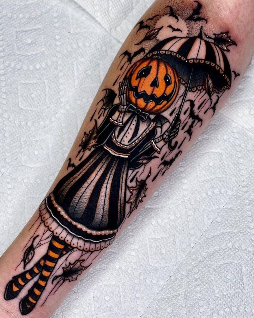 This striking tattoo depicts a figure with a jack o’ lantern head dressed in vintage-inspired clothing.