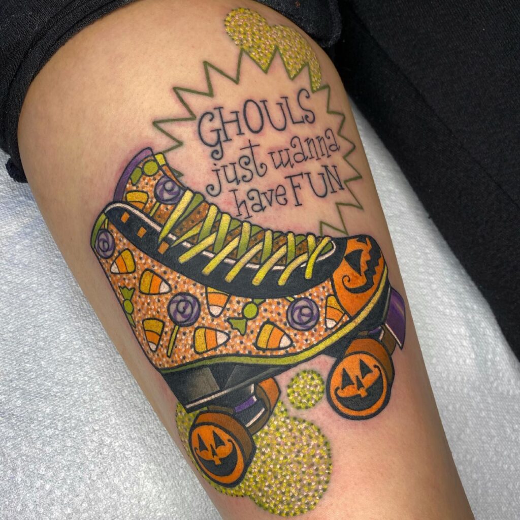 This colorful tattoo combines Halloween fun with retro roller-skating flair. The design features a roller skate decorated with candy corn, lollipops, and sparkling orange details.