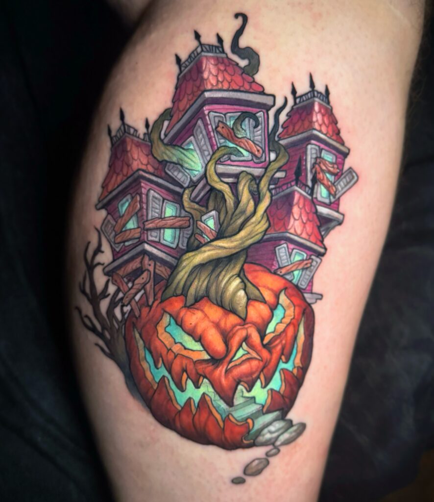 This colorful tattoo transforms a sinister jack o’ lantern into the foundation of a haunted house. The pumpkin’s menacing carved face glows with eerie blue light, enhancing its unsettling expression.