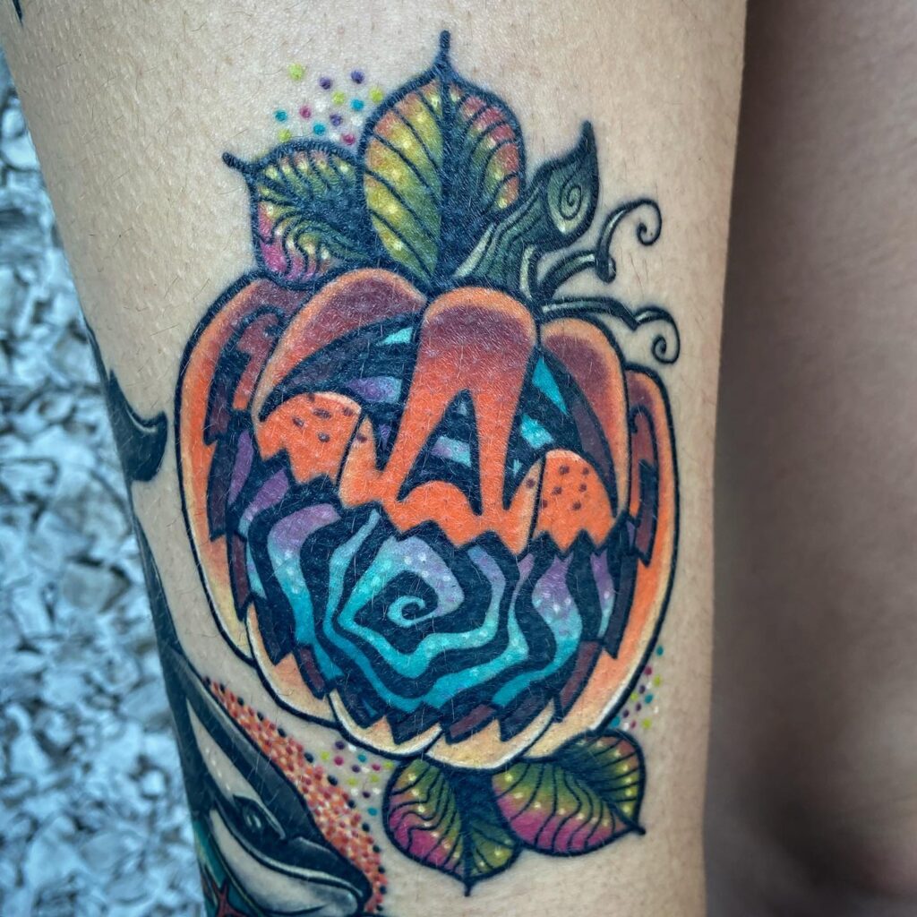 This tattoo gives the classic jack o’ lantern a colorful, psychedelic twist with bold swirling patterns. The pumpkin’s carved grin reveals a spiral of vibrant blues, purples, and teals, creating a mesmerizing effect.