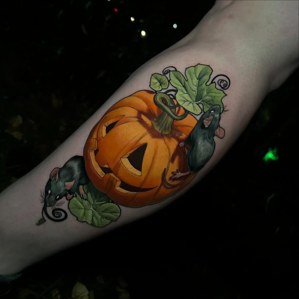This tattoo features a carved jack o’ lantern surrounded by detailed greenery and two mischievous rats. The pumpkin’s classic triangular eyes and wide grin glow warmly, creating a playful Halloween centerpiece.