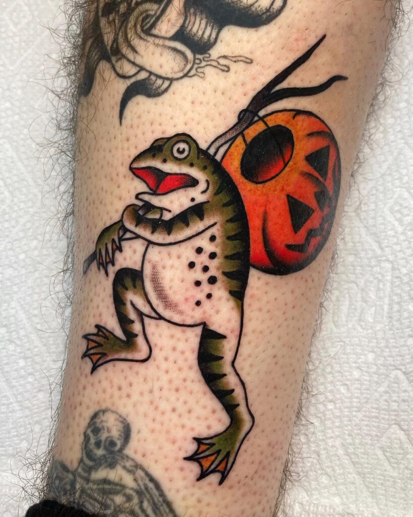 This playful tattoo shows a lively frog carrying a jack o’ lantern trick-or-treat bucket on its back. The frog’s animated stance and open mouth give it a humorous, cartoon-like personality.