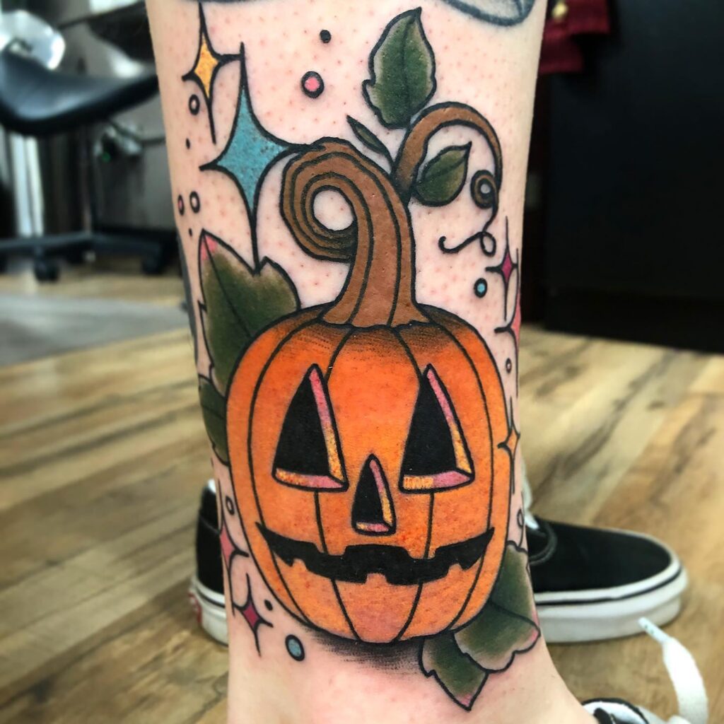 This tattoo showcases a bold jack o’ lantern with a wide, playful grin and bright glowing features. The pumpkin’s uneven shape and textured lines give it character, making it stand out from traditional designs.