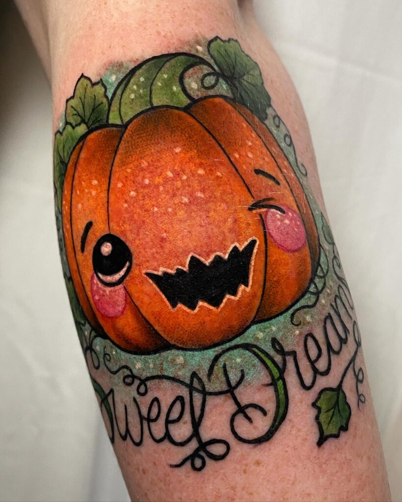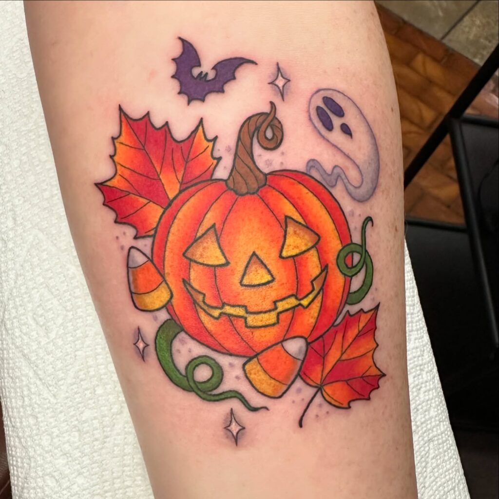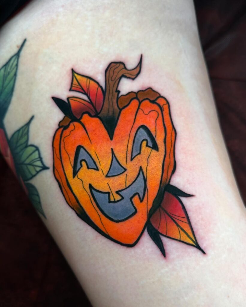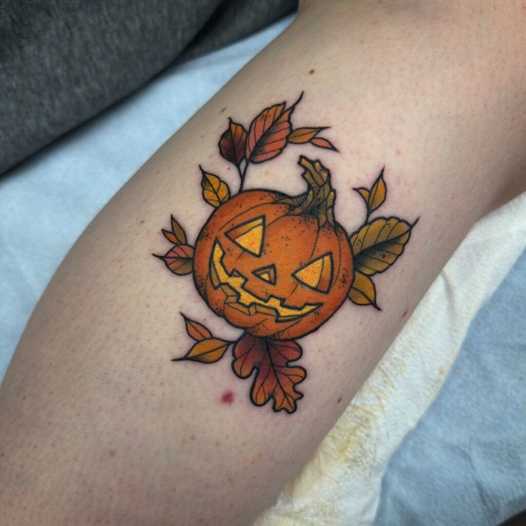 This tattoo features a cheerful jack o’ lantern surrounded by beautifully detailed autumn leaves. The pumpkin’s wide grin and triangular eyes give it a friendly, classic Halloween expression.
