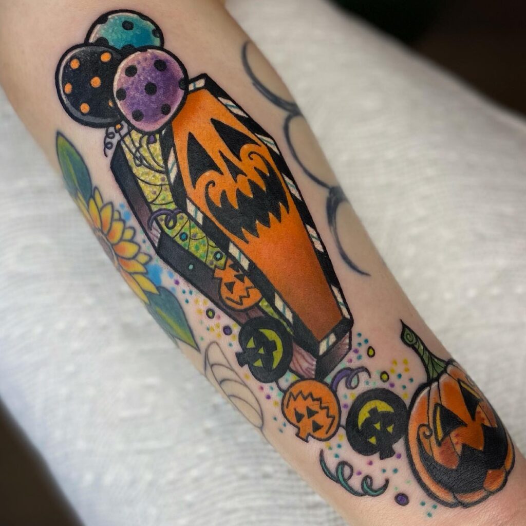 This colorful tattoo combines spooky Halloween imagery with a playful party vibe. At the center, a bright orange coffin decorated with a jack o’ lantern face takes focus.