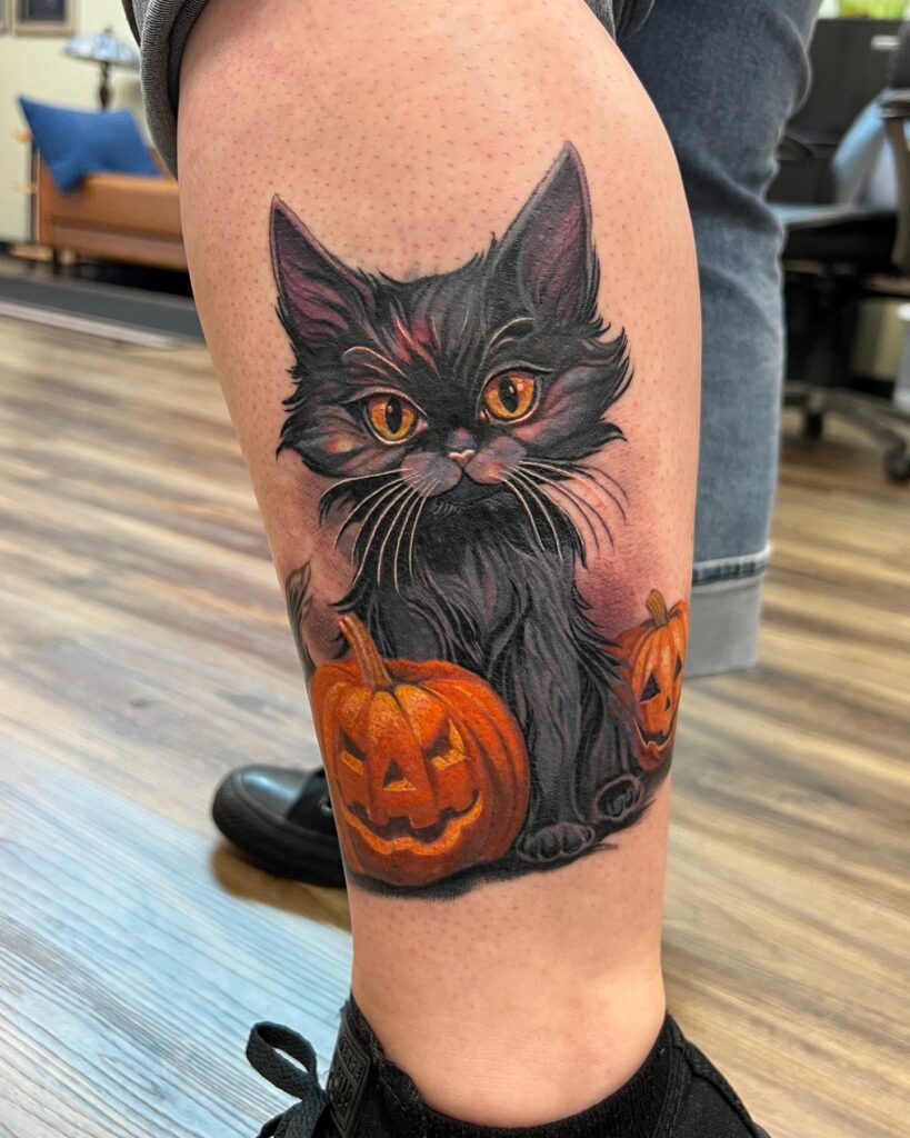 This tattoo captures the mysterious charm of Halloween with a lifelike black cat and glowing pumpkins.