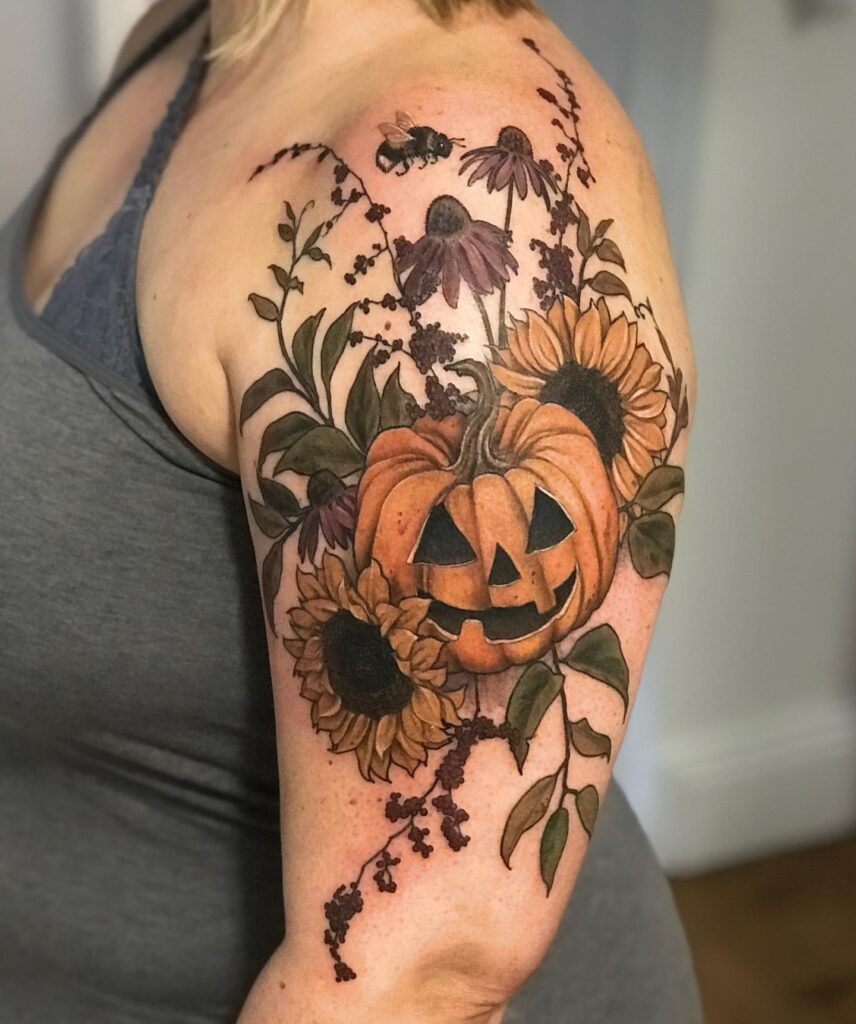 This tattoo blends autumn warmth with Halloween charm, featuring a carved jack o’ lantern surrounded by sunflowers and wildflowers.