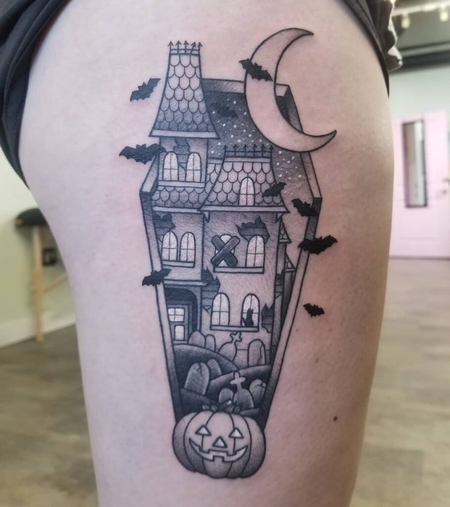 This tattoo captures classic Halloween imagery with a spooky haunted house framed inside a coffin-shaped outline.
