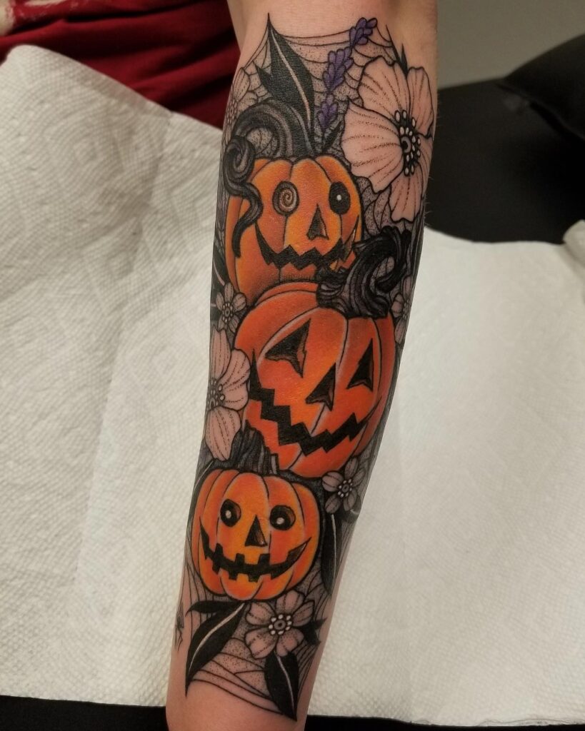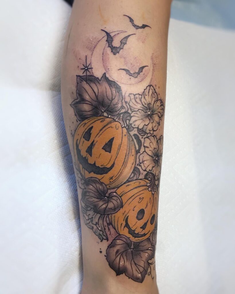 This tattoo beautifully blends Halloween imagery with a touch of elegance, featuring two smiling jack o’ lanterns surrounded by leaves and flowers.