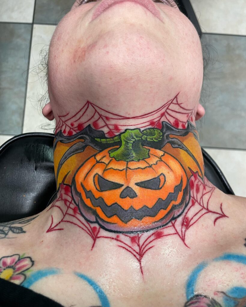 Fierce Jack O’ Lantern Neck Tattoo with Web Accents