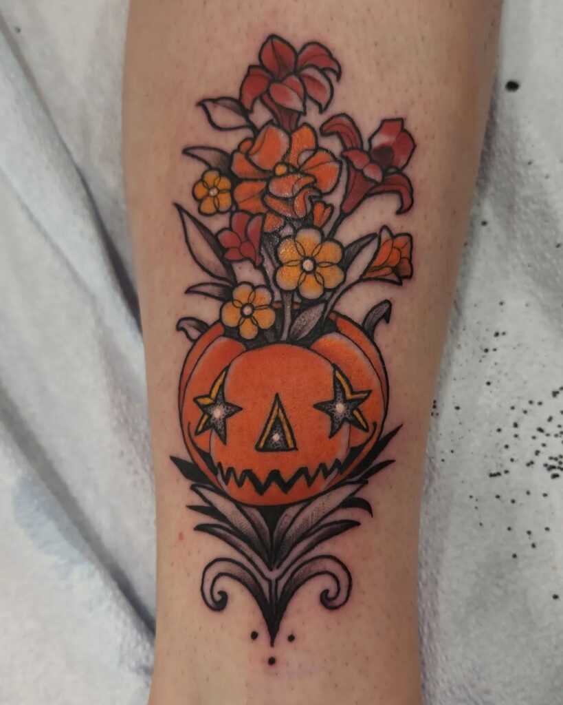 This tattoo shows a creative mix of spooky and elegant design, with a jack o’ lantern acting as a vase.