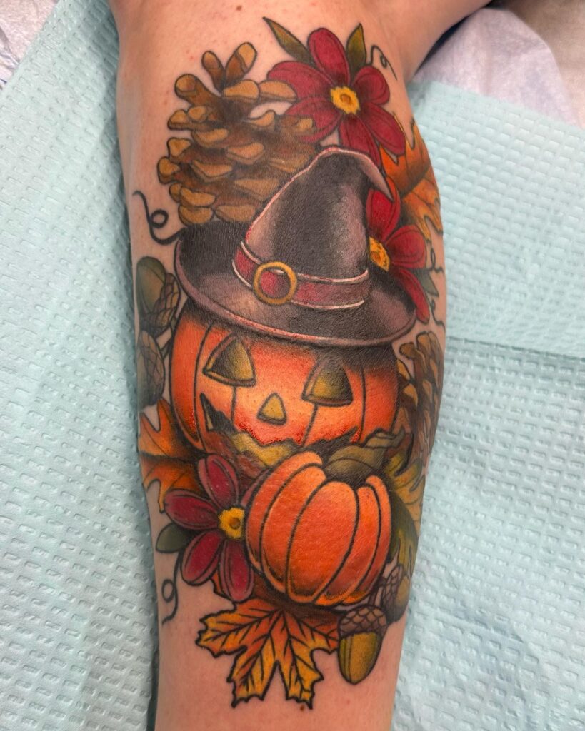 This tattoo captures the cozy magic of autumn with a festive Halloween twist. At the center, a smiling jack o’ lantern wears a classic witch hat, instantly giving it a playful, enchanting personality.