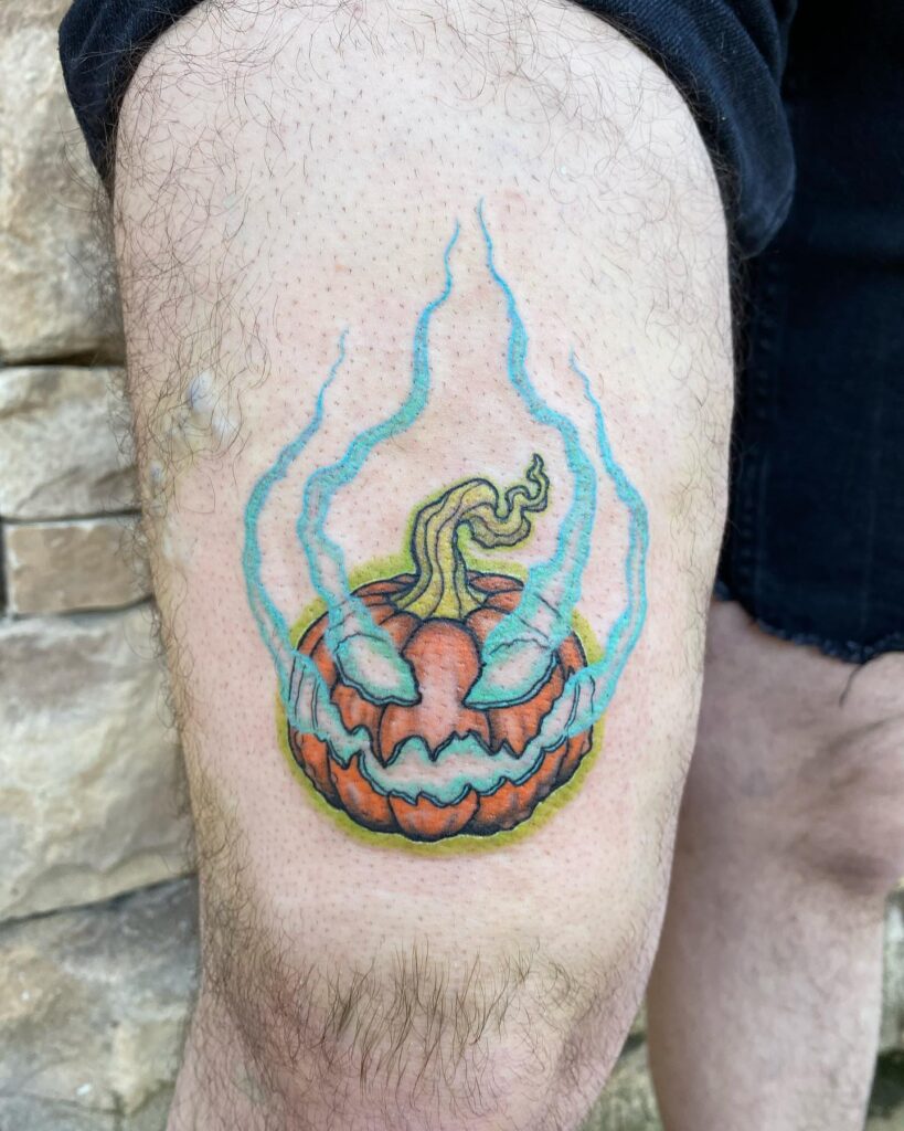 Instead of traditional shading, bright blue flames burst from its eyes and mouth, creating an eerie, supernatural effect. The pumpkin’s orange tones contrast beautifully with the vibrant blue energy, making the design pop against the skin.