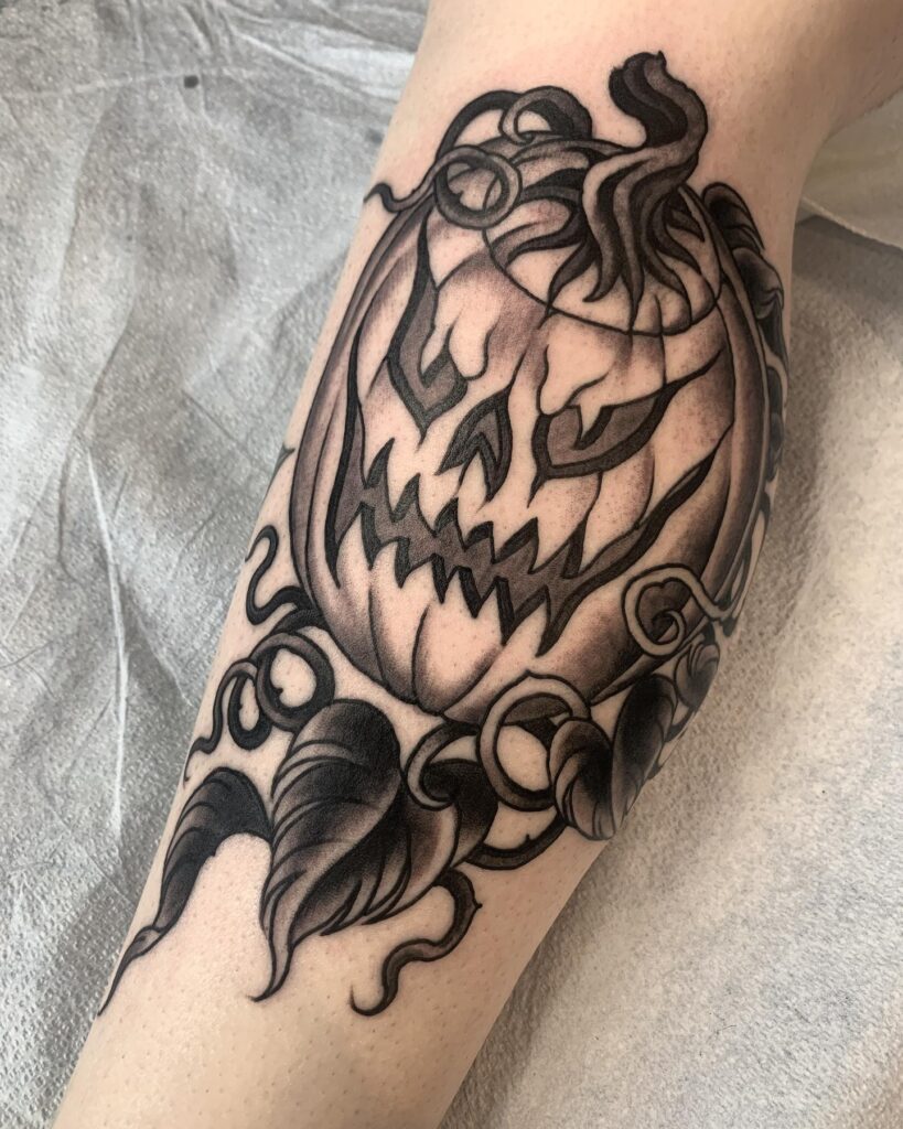 The bright glow of the carved eyes and mouth stands out beautifully against the pumpkin’s orange shading. This design blends spooky and sweet elements, making it perfect for someone wanting a festive yet friendly Halloween-inspired tattoo.