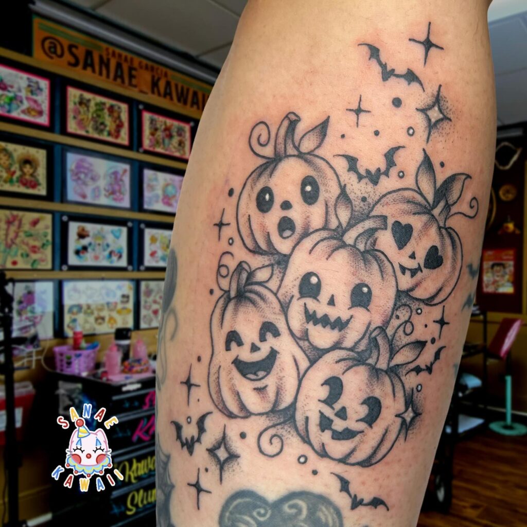This fun tattoo design showcases five jack o’ lanterns, each with a unique and expressive face. From wide-eyed surprise to heart-shaped eyes, the variety of expressions gives the pumpkins a lively, animated personality.