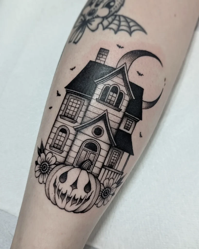 This tattoo blends eerie architecture with classic Halloween imagery for a striking effect. A detailed haunted house stands tall, with sharp rooflines, arched windows, and dark shading that creates a chilling atmosphere.