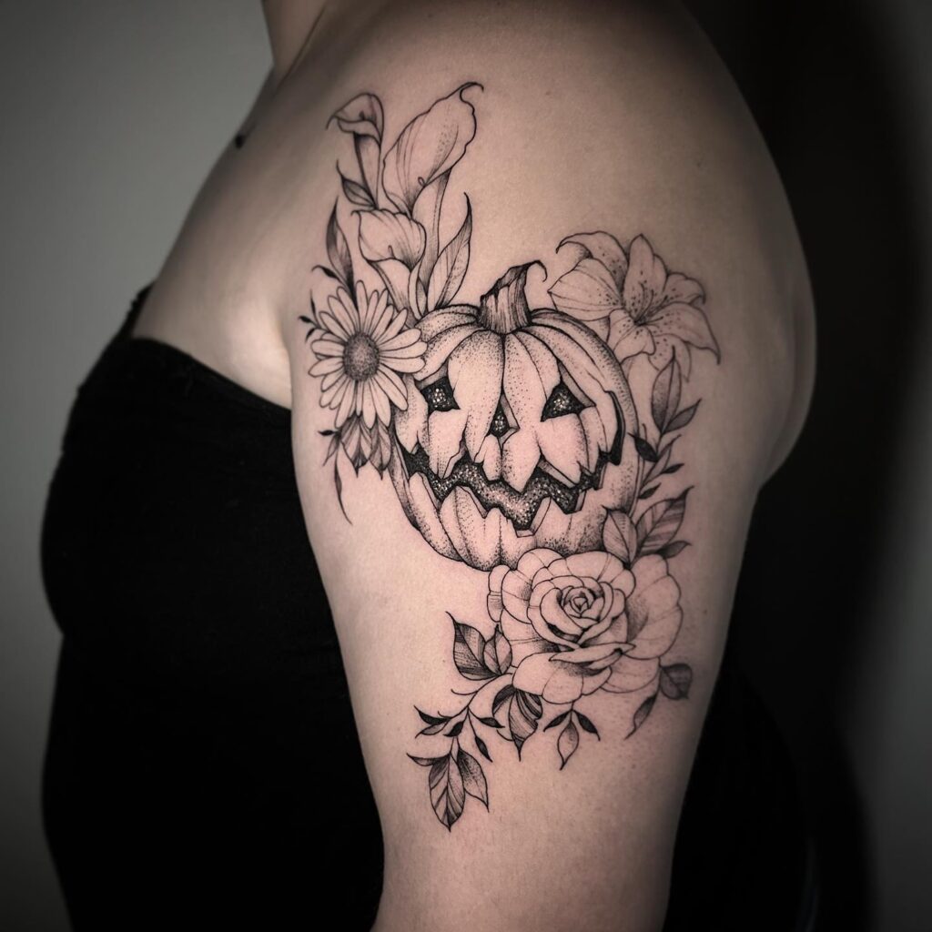 Black ornamental shading beneath the pumpkin balances the composition, giving it a classic, almost vintage tattoo feel. It’s a striking choice for anyone who loves mixing floral beauty with seasonal spookiness.