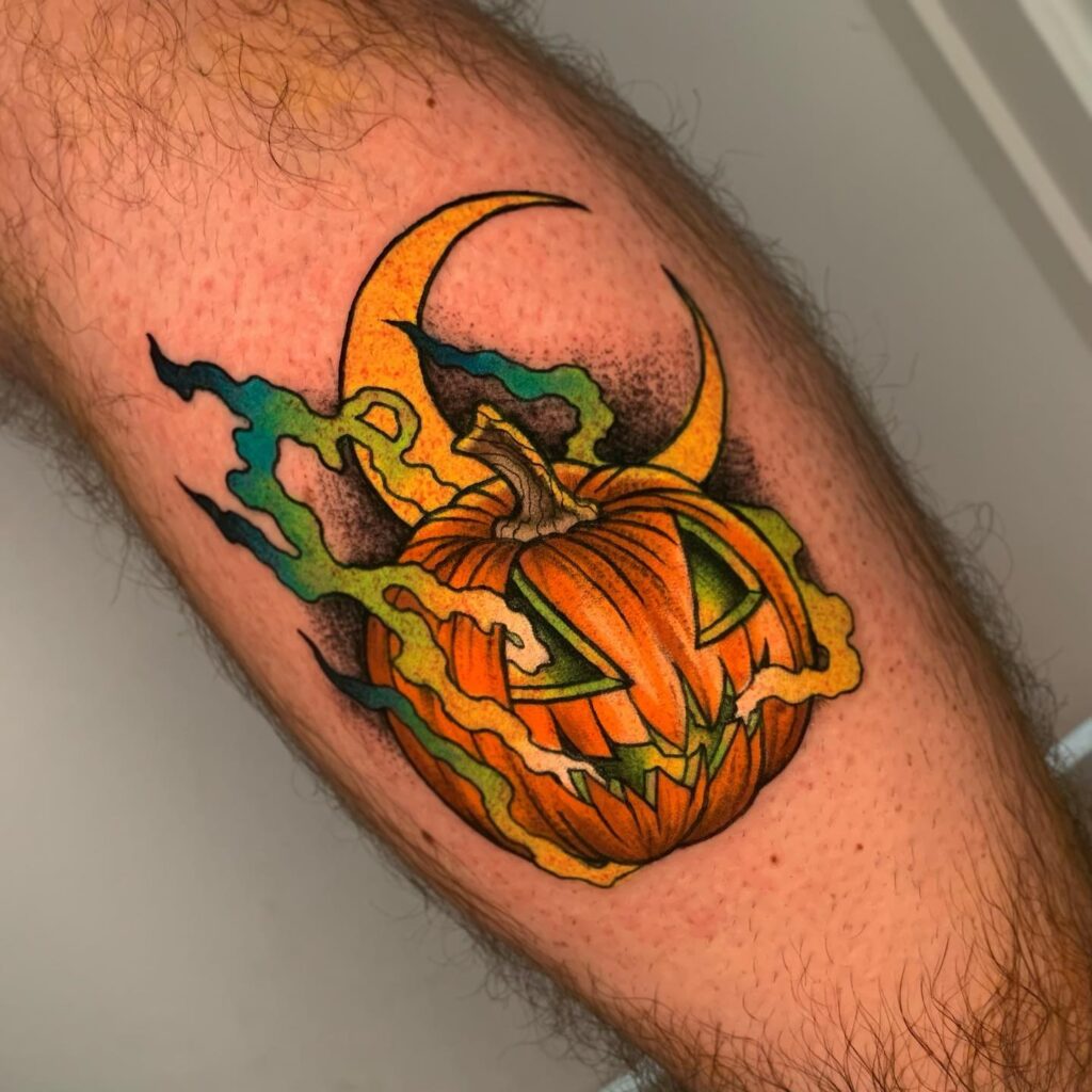 This tattoo features a sinister jack o’ lantern glowing with eerie green light in its carved eyes and grin. A bold crescent moon looms behind, adding to the mystical and haunting atmosphere.