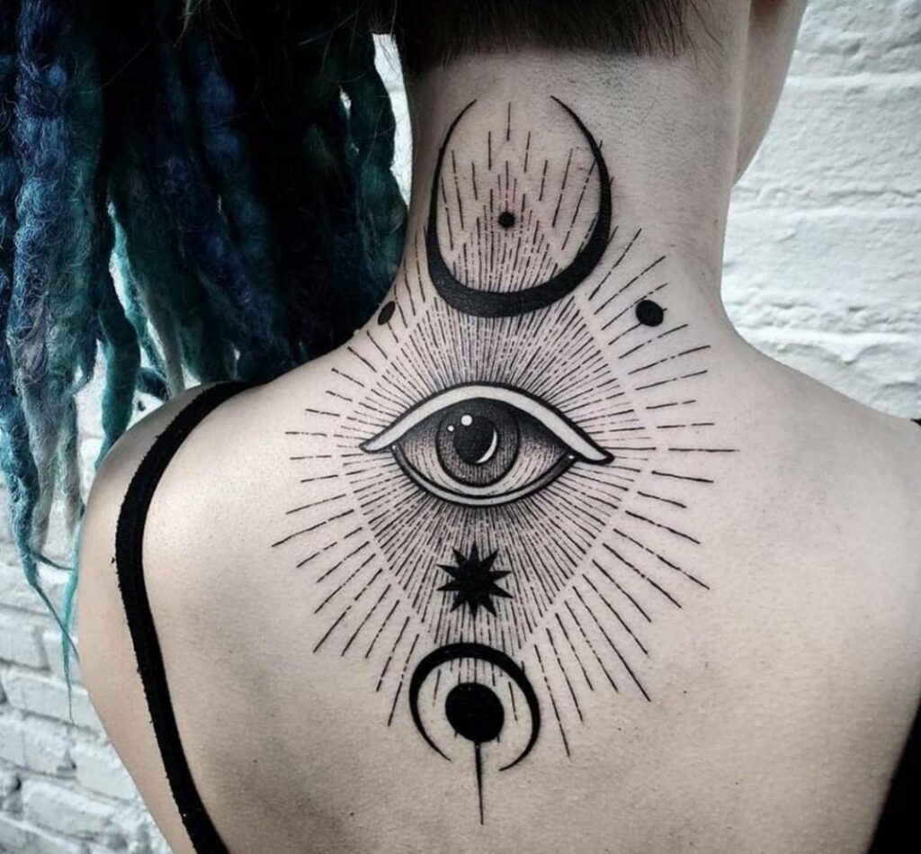 This tattoo features a central all-seeing eye surrounded by celestial elements, radiating mystical energy and spiritual protection.