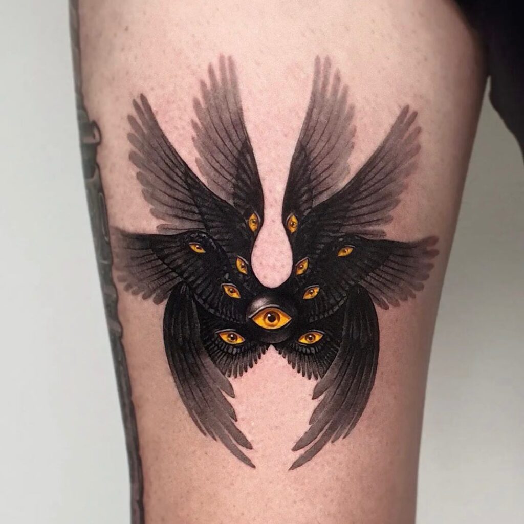 This tattoo presents a striking design of a winged figure inspired by the biblical seraphim, a celestial being often depicted with multiple wings and eyes.