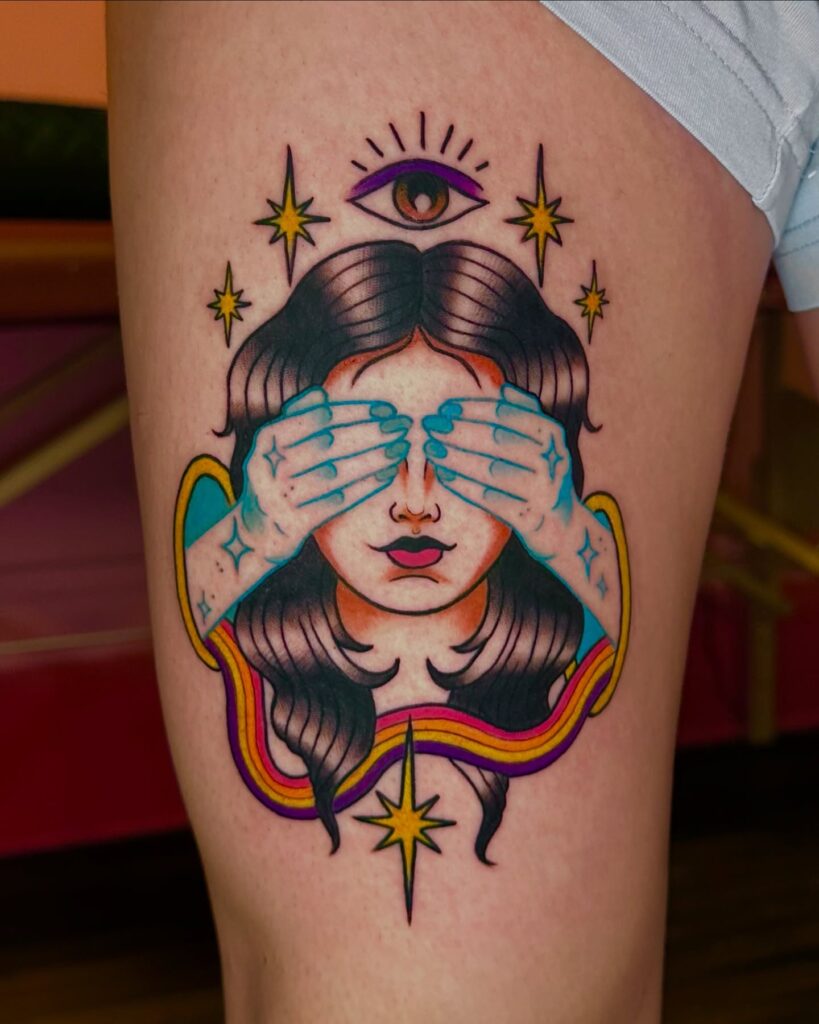 This colorful tattoo portrays a mystical woman with her eyes covered by vibrant blue hands, symbolizing hidden truths or inner vision.