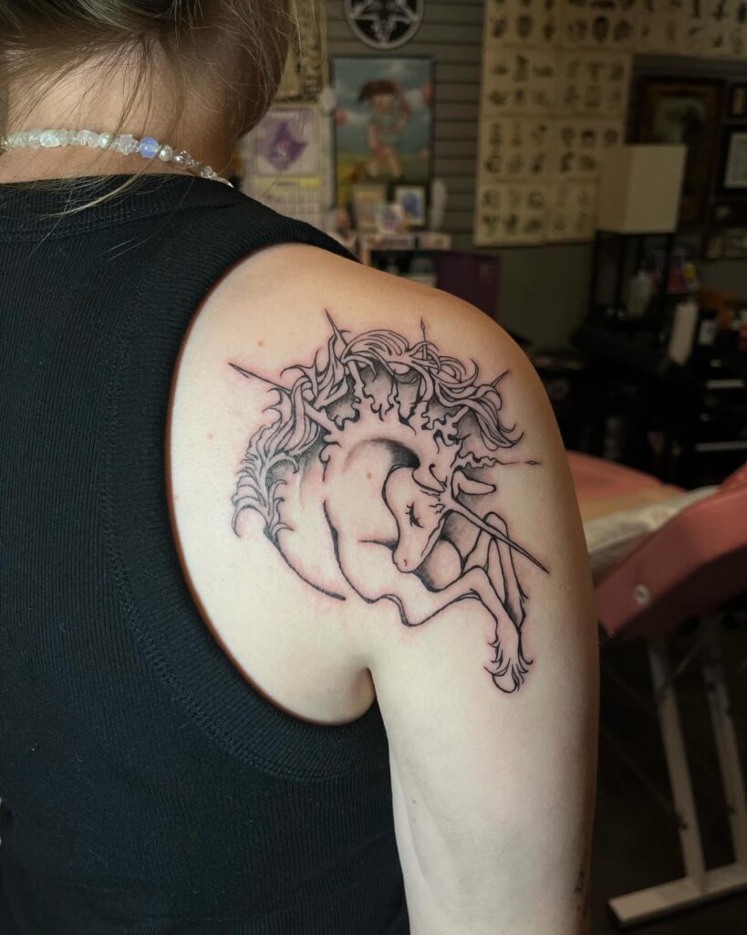 This tattoo depicts a unicorn curled up peacefully, resting on the wearer’s shoulder as if in comfort. The design emphasizes the creature’s elegance, with a flowing mane and spiraling horn adding magical detail.