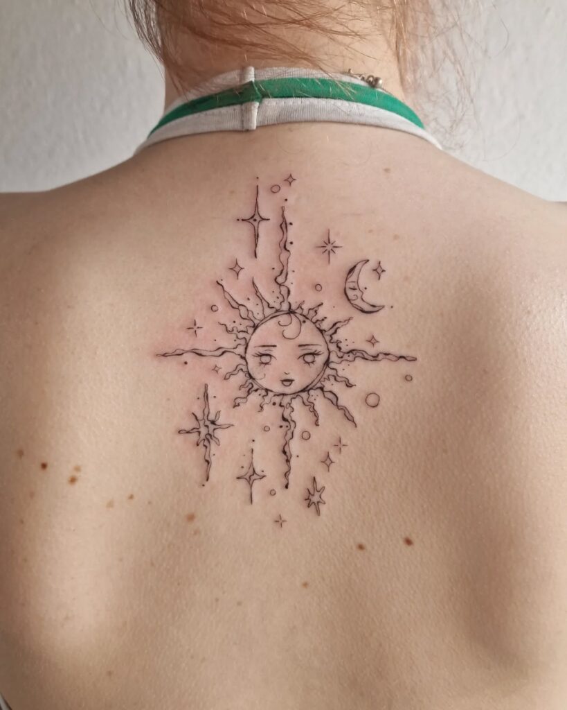 Placed on the upper back, it symbolizes balance, guidance, and cosmic harmony, blending the warmth of the sun with the mystery of the moon. A perfect choice for lovers of astrology and ethereal symbolism.