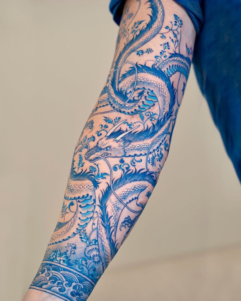 This porcelain blue dragon sleeve tattoo captures the elegance of traditional Chinese artistry.