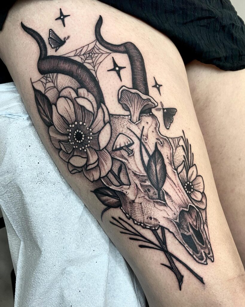 Goat Skull with Flowers and Moths Thigh Tattoo