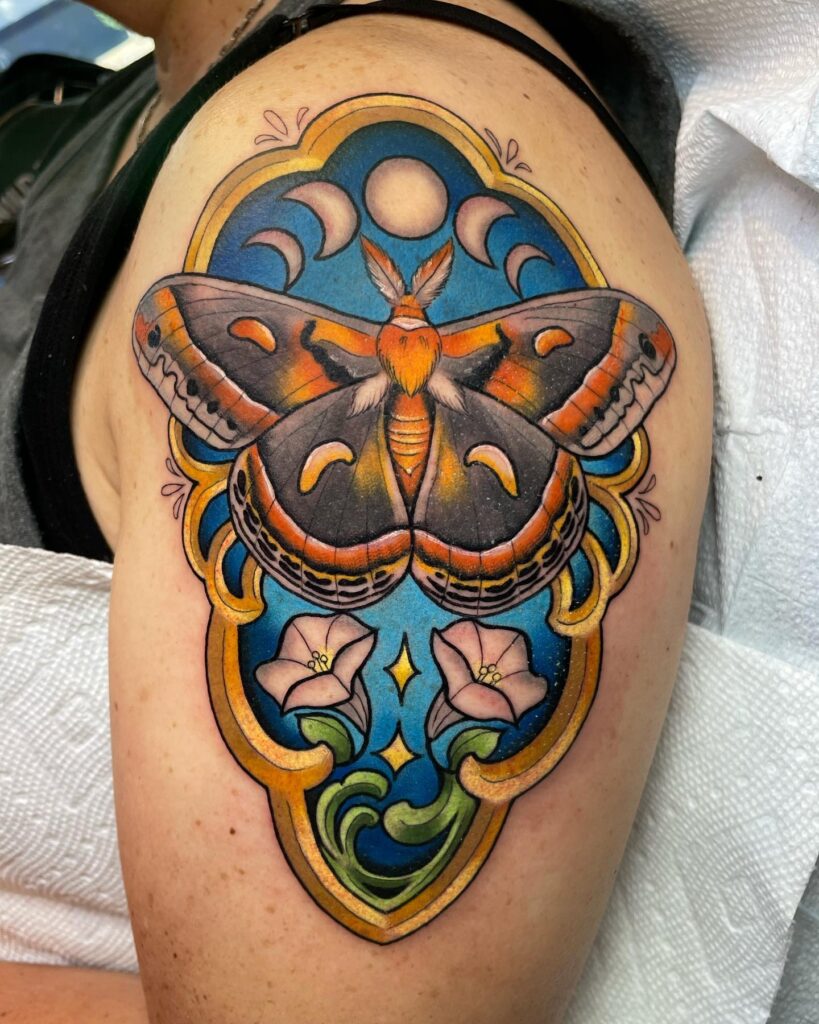 This colorful upper arm tattoo features a striking moth framed by rich, ornamental details. Above the wings, the phases of the moon symbolize cycles, transformation, and balance.