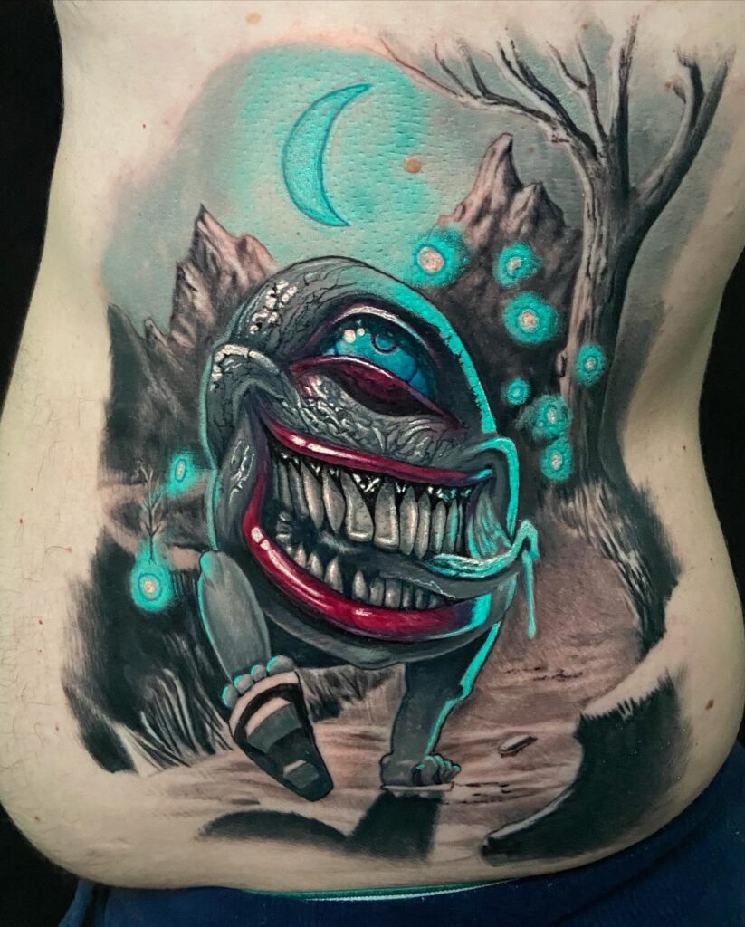 This tattoo showcases a surreal, monstrous creature with a single glowing eye and an exaggerated toothy grin. Its twisted form, dripping tongue, and sharp claws add a nightmarish edge, while the neon teal highlights give it an otherworldly glow.