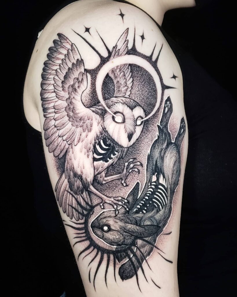 This striking tattoo portrays an owl and hare locked in a dramatic clash, both rendered with haunting skeletal details.