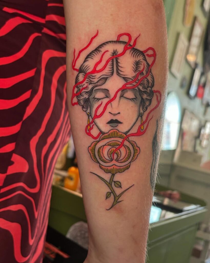 This tattoo depicts a vintage-style woman framed by bold, flowing red flames, radiating mystical intensity.