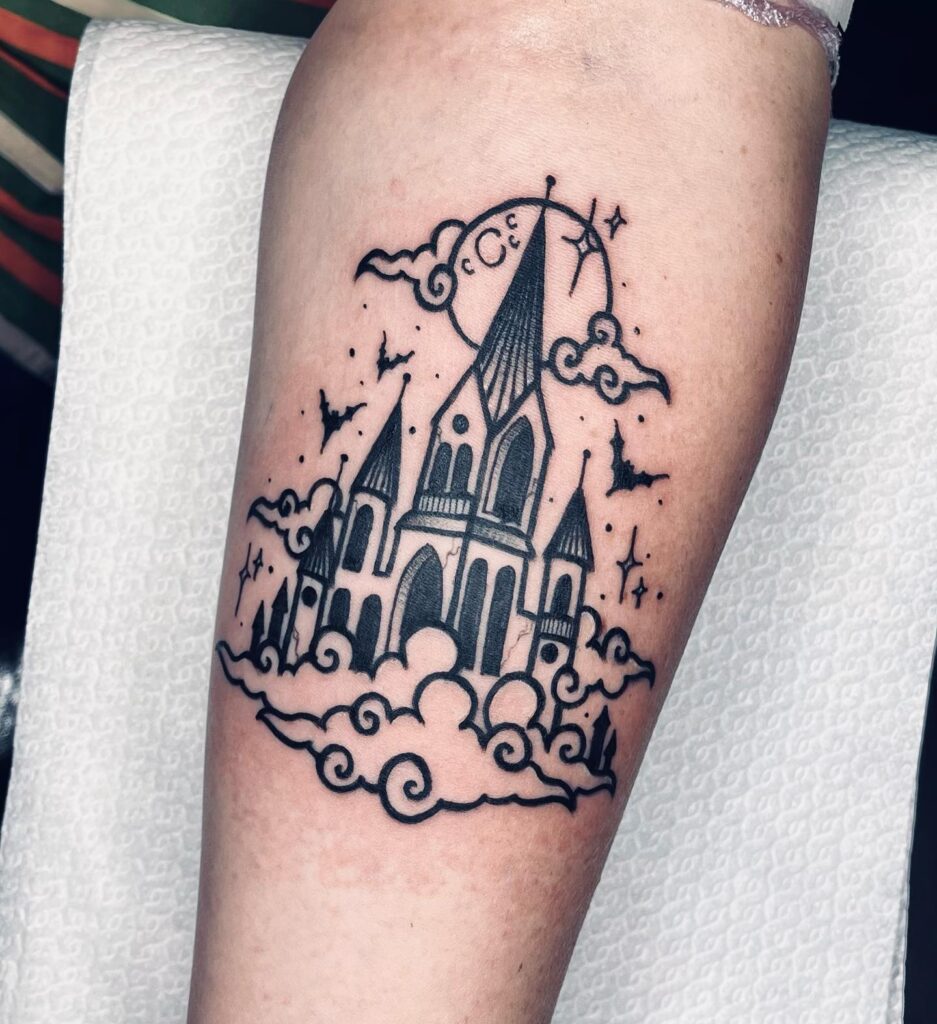 This tattoo depicts a grand gothic-style castle resting on swirling clouds, giving it a dreamy, otherworldly presence.